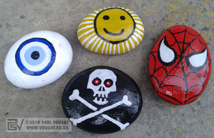 Acrylic painted and varnished stones hidden for children to collect or re-hide.